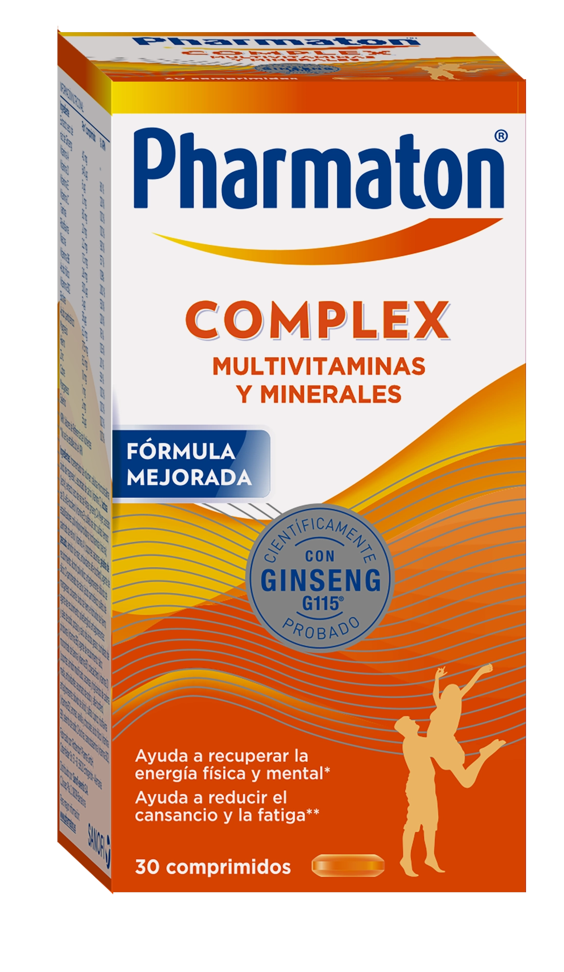 Pharmaton con Ginseng contiene una combinación de vitaminas, minerales y extractos de plantas, con el ginseng como componente principal. Su formulación está diseñada para contribuir al bienestar general y a la vitalidad, especialmente en situaciones de cansancio y estrés. Específicamente, incluye vitaminas del complejo B (B1, B2, B6, B12, niacina, ácido pantoténico, ácido fólico y biotina), vitamina C, vitamina E, vitamina D3, minerales como el hierro, el zinc y el magnesio, y el extracto de ginseng. La cantidad precisa de cada ingrediente puede variar ligeramente dependiendo de la presentación del producto (cápsulas o comprimidos). Es importante consultar el prospecto para obtener información detallada sobre la composición de cada presentación específica.